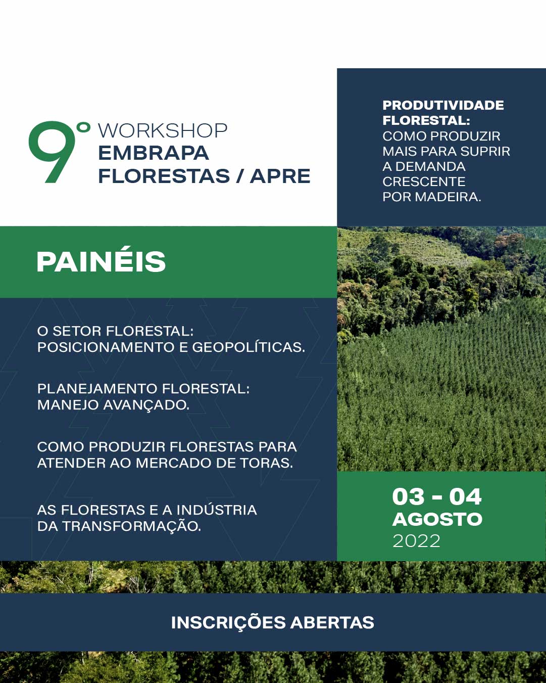 Mais informações: https://apreflorestas.com.br/evento/9o-workshop-embrapa-florestas-apre/