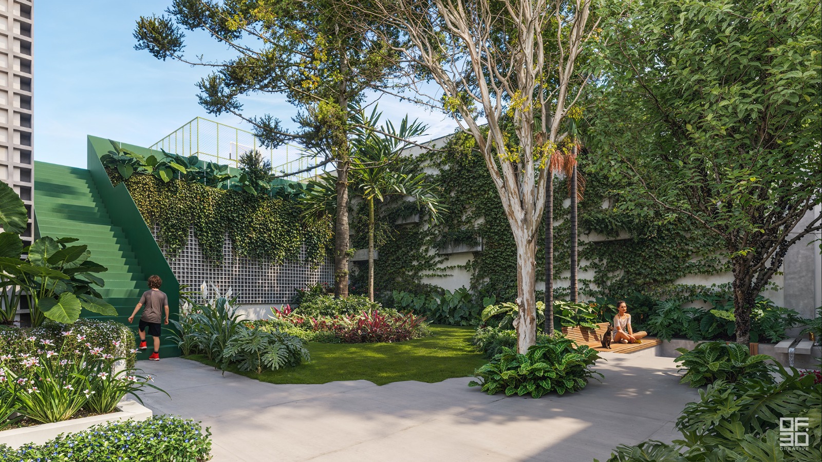 O projeto também propõe uma paisagem comestível, com ervas aromáticas e frutíferas como goiabeira, jabuticabeira e grumixama, além de placas educativas sobre as plantas, estimulando o contato das crianças com a natureza. O pátio central do empreendimento será um espaço compartilhado de relaxamento e lazer ao ar livre — uma tradução concreta da biofilia como experiência cotidiana.