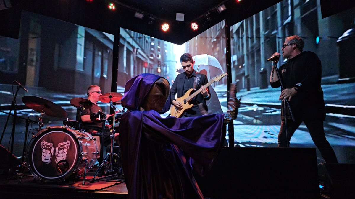A experiência do Banana Gun é amplificada por alta tecnologia. Enquanto o power trio de músicos se materializa no palco, os painéis de LED exibem videoclipes com efeitos criados por Inteligência Artificial (IA), assinados pelo curitibano Raul Machado.