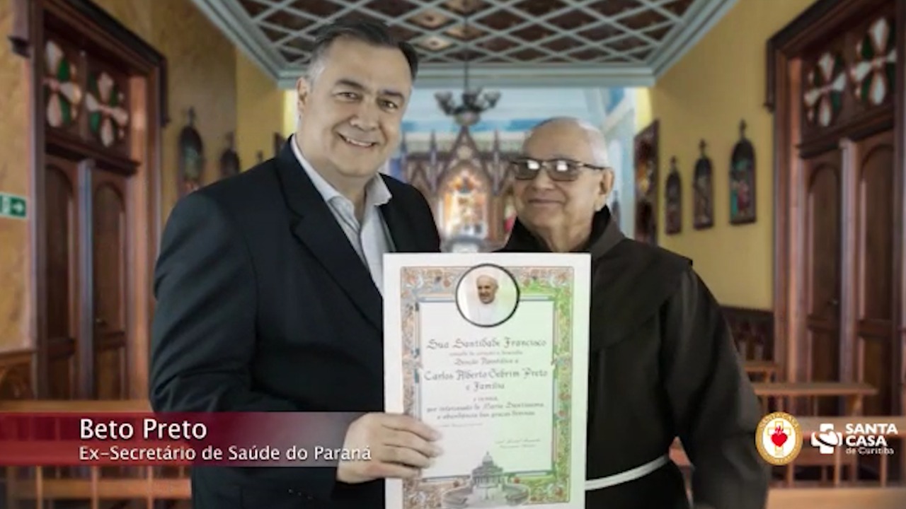 O Papa Francisco homenageou o ex-secretário estadual de Saúde, Beto Preto, com a Benção Apostólica. O papa agradeceu a dedicação de Beto Preto em dar apoio às Santa Casas do Paraná, em especial a de Curitiba. O diploma com a benção do Papa Francisco foi entregue pelo Bispo Emérito Dom Diamantino Prata de Carvalho. “É uma alegria representar a nossa instituição Pro Saúde e também a nossa Irmandade da Santa Casa de Misericórdia, entregando para o nosso amigo, doutor Beto Preto, a benção papal como reconhecimento pelo seu apoio e sua colaboração em também ajudar essa nossas entidades”, destacou Dom Diamantino.