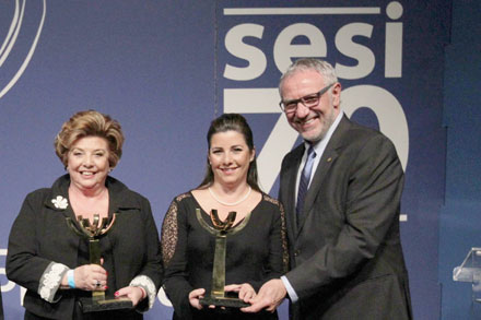 Elizabeth Castor, viúva de Belmiro e dirigente do Centro de Educação João Paulo II, e Alessandra Vieira, filha de Zé Eduardo, receberam o troféu, muitas palmas e palavras de enaltecimento às obras dos homenageados, na fala de Edson Campagnolo, presidente da Federação das Indústrias.