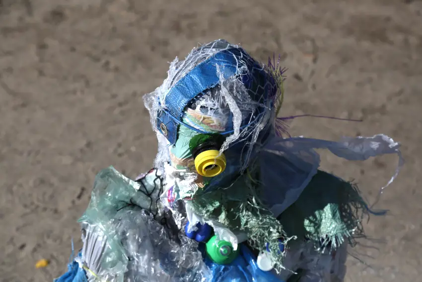 Figuras humanas feitas com plásticos retirados das costas canadenses foram colocadas na Praia de Kitsilano, em Vancouver, para chamar a atenção. Mert Alper Dervis/Anadolu Agency/Getty Images