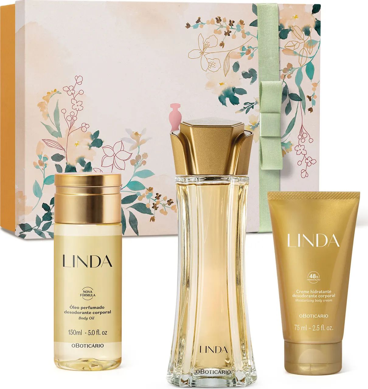 O Kit Presente Dia das Mães Linda apresenta três itens da perfumaria feminina que representam a feminilidade e o poder da mulher, tornando-se uma excelente sugestão de presente para o Dia das Mães. Nele, há o Linda Desodorante Colônia, que celebra a mulher brasileira trazendo o brilho e a alegria das notas frutais, a delicadeza do buquê floral e a personalidade e potência do fundo amadeirado. Com fórmula ultra-hidratante, há também o Creme Hidratante Desodorante Corporal Linda, que entrega pele renovada, macia e levemente perfumada com a fragrância irresistível de Linda. Por fim, ideal para uso diário, o Óleo Perfumado Desodorante Corporal de Linda deixa o banho relaxante e perfumado – um item de autocuidado inspirado nessa fragrância feminina representando a mulher brasileira, que sabe das próprias virtudes que potencializam a beleza dela.