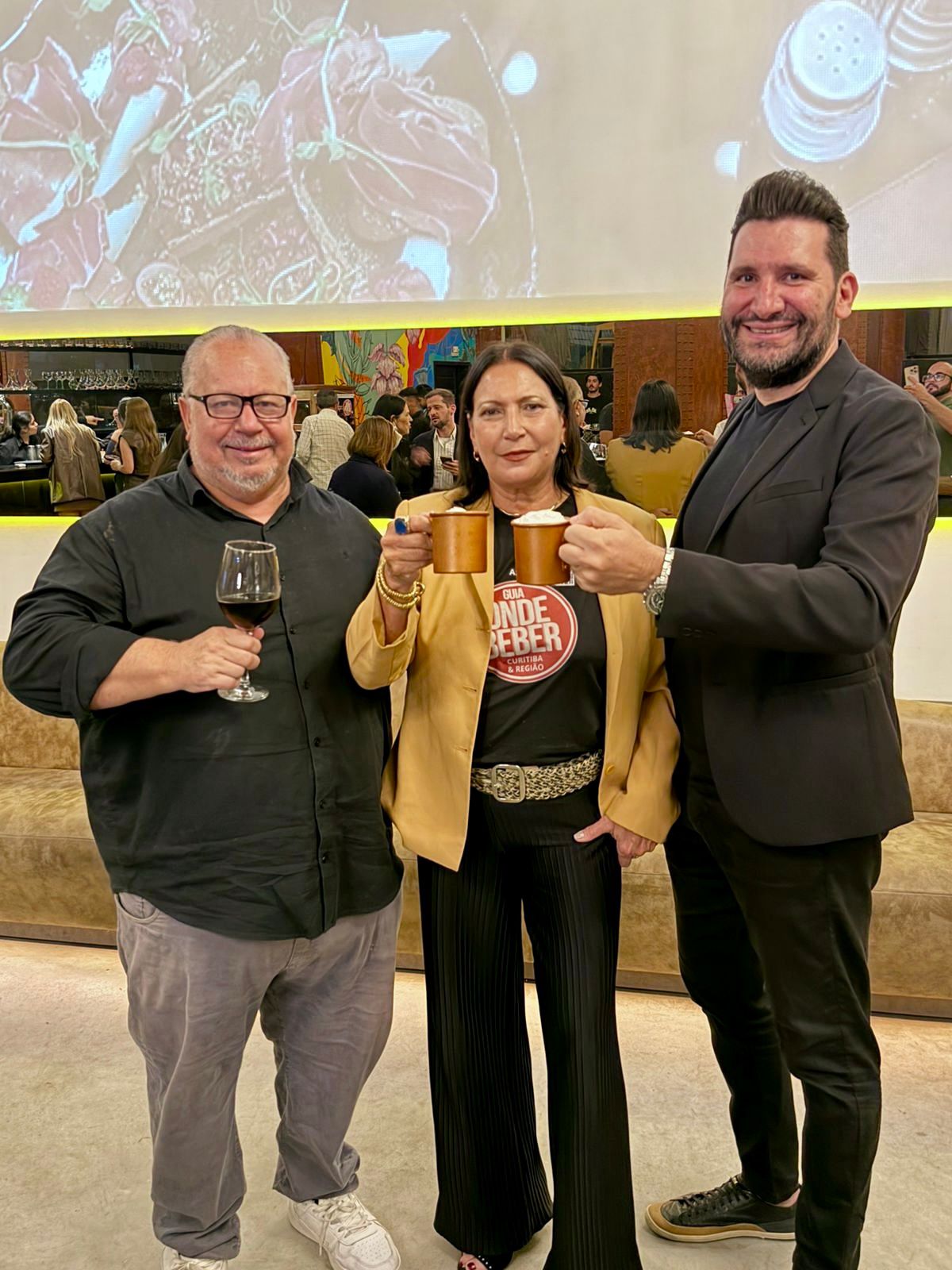 Sérgio Medeiros e Nilceia Almeida com Juliano Maia no lançamento do aplicativo Guia Onde Beber Curitiba, parceria entre a Curitiba Honesta e o Minha Gula Curitiba. Com assinatura de R$49,90 ao ano, o usuário pede uma bebida e ganha outra em cerca de 100 bares e cafeterias da cidade. O double inclui drinks, chope, vinho, café, suco e até milkshake.