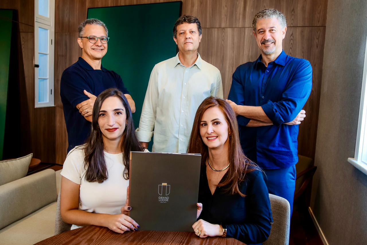 A incorporadora Partilha abriu o plantão de vendas do Grand Lodge Batel, novo residencial de alto padrão na Rua Bispo Dom José. O espaço ocupa uma das casas centenárias integradas ao projeto, que serão preservadas e incorporadas às áreas comuns e à fachada. Na foto, Sergio Padilha, diretor da Partilha; Luiz Claudio Vieira, sócio; Gustavo Pinto, arquiteto do projeto; Izabela Camarotti da Silva, arquiteta da incorporadora; e Dívian Serenato, gestora comercial.
