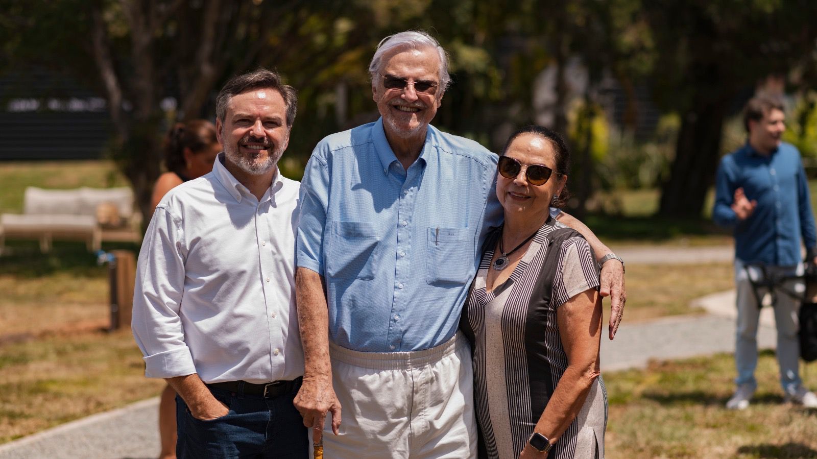 Filipe Biscaia Demeterco, diretor-presidente da Incorporadora Piemonte, com os pais Ruy e Dora Demeterco, na entrega da Praça Legado, espaço temporário de convivência criado pela incorporadora no encontro entre Batel e Bigorrilho. A família Demeterco chegou a morar no terreno que hoje se abre à cidade como área pública.