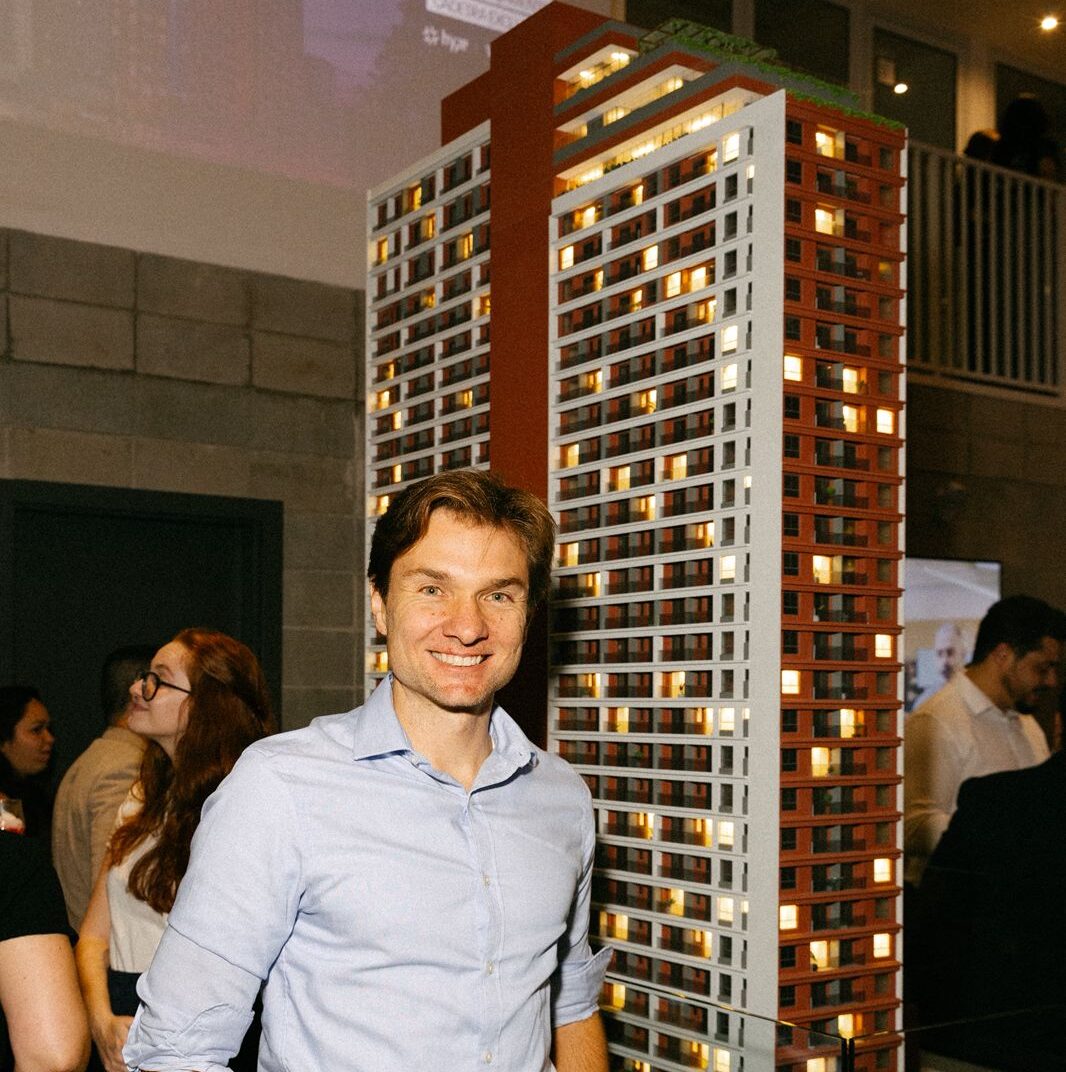 Daniel Caiado, sócio da Hype Empreendimentos, durante o lançamento do Fresta Hype Living, novo projeto da incorporadora que aposta na revitalização do centro de Curitiba e na conexão entre importantes vias da região. O empreendimento também apresentou a cadeira Fresta, criada em parceria com a Woodskull como extensão do conceito do projeto.