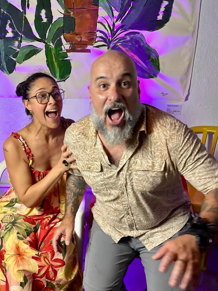 Camila Albuquerque Alves, da Cozinha Jardim — conhecida pelas tortas de caramelo salgado — e Mario Nicolau, proprietário do Espaço SFco 179 e do restaurante Tijolo, durante a primeira edição da festa Sangue Latino, realizada no Centro Histórico de Curitiba. O evento reuniu música, gastronomia e referências culturais da América Latina.
