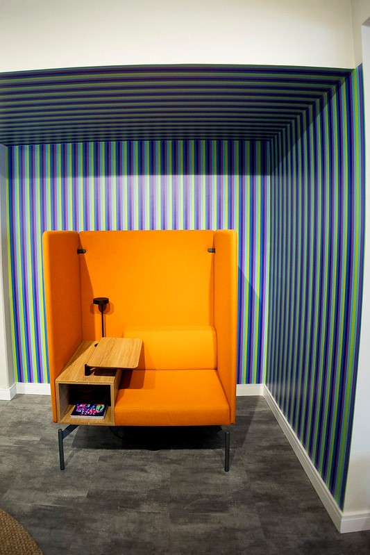 Assinado pelo escritório Jordana Fraga ID, o projeto apostou em uma composição leve, colorida e cheia de personalidade. Tons vibrantes tomam conta da paleta, combinados a elementos gráficos marcantes que dão ritmo ao ambiente. O painel central, desenvolvido pela Adsive Decor, funciona como ponto focal, enquanto os desenhos de pinhão de Alexandra Justi trazem uma camada afetiva e regional, conectando o espaço à identidade curitibana.