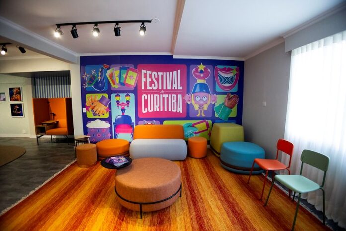 Entre Espaços por Sumi Costa – No Hotel Mabu Curitiba Business, uma suíte do 10º andar deixou de ser apenas um espaço de hospedagem para assumir um novo papel durante o Festival de Curitiba. Em 2026, o ambiente foi completamente transformado para abrigar a Sala de Imprensa do evento — e o resultado está longe do óbvio: um espaço que mistura a atmosfera intimista de um quarto com a energia vibrante dos bastidores do teatro.