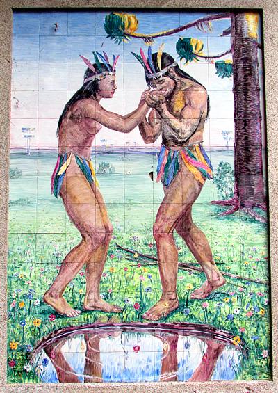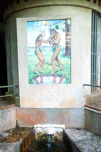 Fiquei curioso em saber a autoria do painel em azulejos pintados e das esculturas, ao pé, onde a água continua jorrando. Do belo painel com um casal de índios e pinheiros, com cerca de 1,40 m x 2.00 m, a única pista, assinalada num dos azulejos, é que ele foi “queimado na fábrica de louças Trevisan | 1941”.