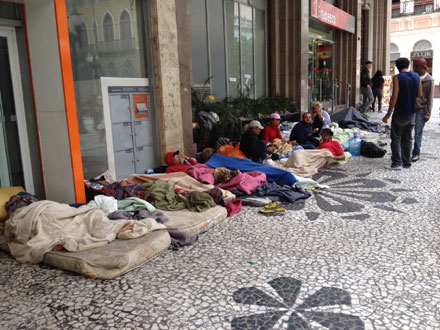 Prezado Murá, assim está Curitiba, a cidade outrora (!?) de 1o mundo… A1a foto,Rua das Flores, sábado às 11h30, dia 07/11. A 2a, Com. Araújo, mesmo sábado. Há inúmeros pontos iguais a estes na cidade. Ampliando a 1a imagem,percebe-se: não há nenhum idoso, ou criança ou jovem; todos são adultos, imagino entre 30 e50 anos.Uns têm até boa aparência, celular na mão e tênis de marcas famosas…perguntei para um dos dois que estão em pé, se eram de Curitiba… “não, mandaram a gente pra cá, acidade é boa! …” (Boa pra quem ou pra quê?)… Quem são, quem os mandou,qual o objetivo, o que fazem? O calçadão da XV está intransitável: grupos musicais (índios, evangélicos e ‘coveres’ diversos), pregadores “religiosos” com som próprio, ambulantes e artesãos com produtos espalhados no chão em 6 quarteirões, da Boca à UFPR, “chefs”e biroscas de várias origens gastronômicas…, agenciadores de muitas origens, som alto de todas as origens, prostituição e drogas à luz do dia…Perguntei pra um onde  tinha um “fininho”…aqui mesmo dotô!…E a Prefeitura? E o Resgate Social, a Vigilância Sanitária? E a Guarda Municipal?Não existe ali nenhuma segurança para um passeio, compras em lojas ou acesso a caixas eletrônicos, enfim, para mães e filhos, famílias…Imagino a impressão do  …Imagino a impressão do turista e a intranqüilidade do comércio regular, do qual se exige tudo. E a Prefeitura devagar, a 40 por hora e de bike…alô Gustavo! Use seu tênis e corra, a cidade precisa urgente!