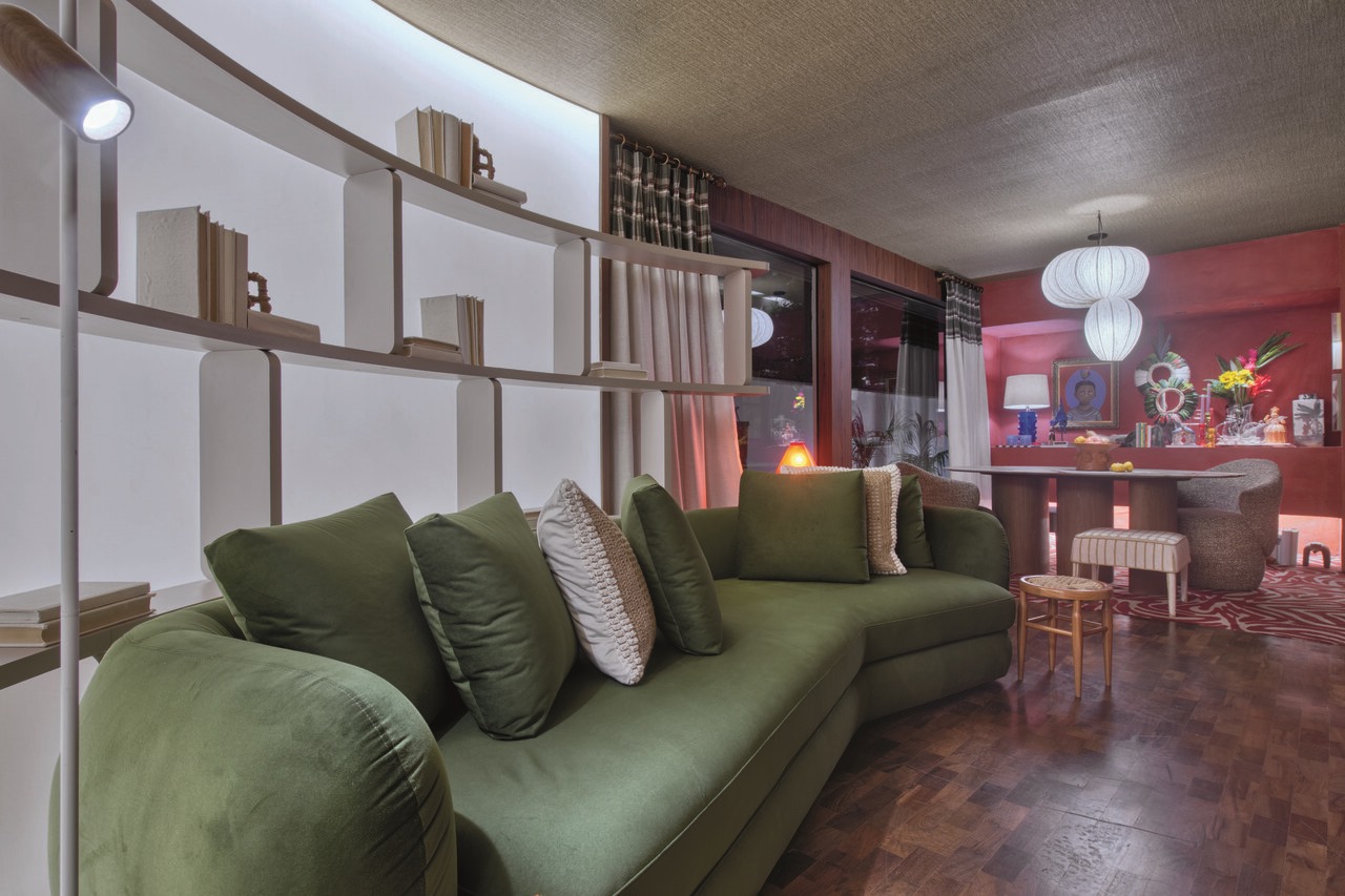 Inspirado na nossa brasilidade e na força dos artistas populares, Roger traduziu o estilo maximalista com uma elegância despretensiosa e cheia de vida. O resultado? Uma explosão de cores e sensações: o bordô intenso que cobre do piso ao teto, o verde exuberante do sofá, e os amarelos queimados das poltronas e da mesa de jantar criam um cenário ao mesmo tempo vibrante e acolhedor — uma verdadeira celebração da mistura que é o Brasil.