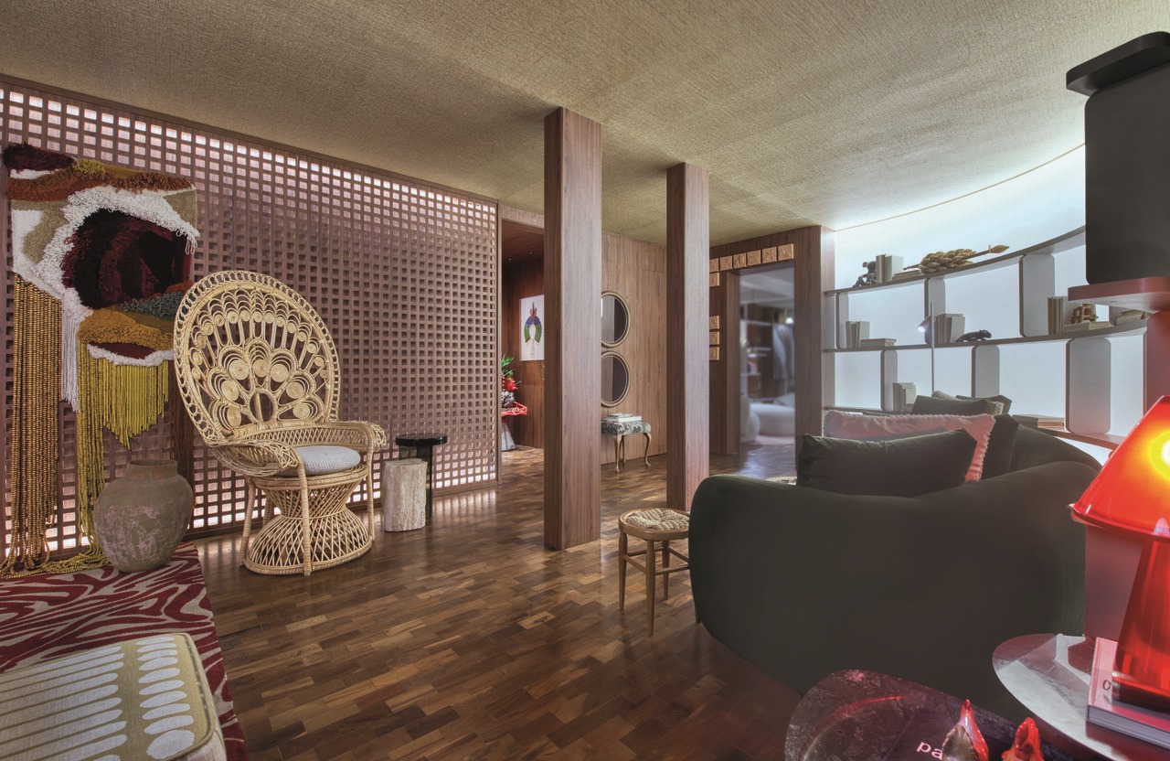 Nos detalhes, o projeto mostra toda sua sofisticação: a pedra natural da mesa de jantar, a marcenaria em pau-ferro, o veludo macio que reveste o sofá Astro e a poltrona Pli. Tudo pensado para criar um ambiente com alma, onde o design brasileiro brilha em cada curva do mobiliário orgânico.