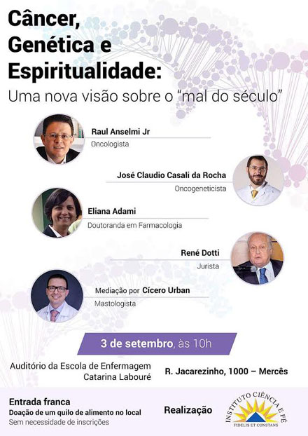 Adami será um dos debatedores da mesa redonda “Câncer, Espiritualidade e Genética”, dia 3 de setembro, sábado, às 10 horas, na Escola Catarina Labouré (Rua Jacarezinho, 1000, Mercês).