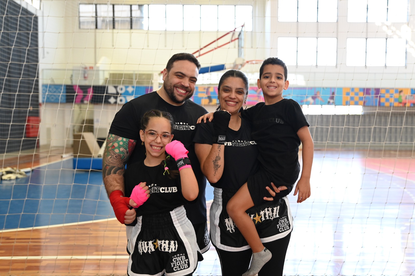 Diego, Priscila, Valentine e Augusto praticam Muay Thai em família. Crédito: CWB Fight Club