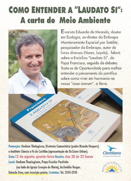 Pesquisador e coordenador do Grupo de Inteligência Territorial Estratégica – GITE da Embrapa -, Evaristo Eduardo de Miranda, doutor em Ecologia pela Universidade de Montpellier (França), autor de ampla obra sobre Ecologia e Meio Ambiente e também autor de análises sobre o mundo da crença religiosa – em livros como “O Íntimo e o Infinito” e “Vá entender esses católicos” – analisará a encíclica “Laudato Si” do Papa Francisco, em Curitiba. Será no dia 12 der agosto, no Studium Theologicum, Praça Ouvidor Pardinho, às 20 horas.