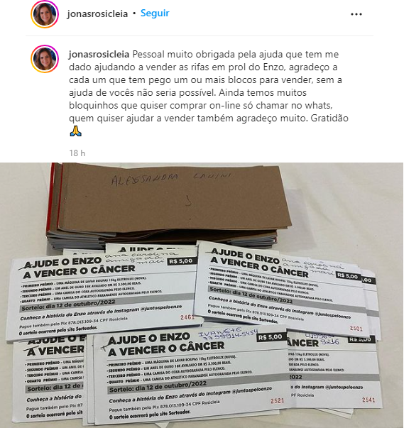“Muito obrigada pela ajuda que tem me dado ajudando a vender as rifas em prol do Enzo, agradeço a cada um que tem pego um ou mais blocos para vender, sem a ajuda de vocês não seria possível. Ainda temos muitos bloquinhos que quiser comprar on-line só chamar no whats, quem quiser ajudar a vender também agradeço muito. Gratidão”.