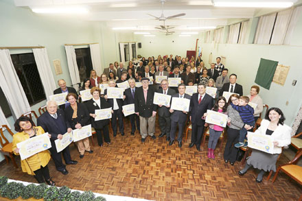 IMG_7892Na significativa cerimônia de entrega dos diplomas ‘Personagem do Bem’, outorgados pela Casa dos Pobres São João Batista, de Curitiba, no final de julho, aparecem todos os homenageados e diretores da instituição.