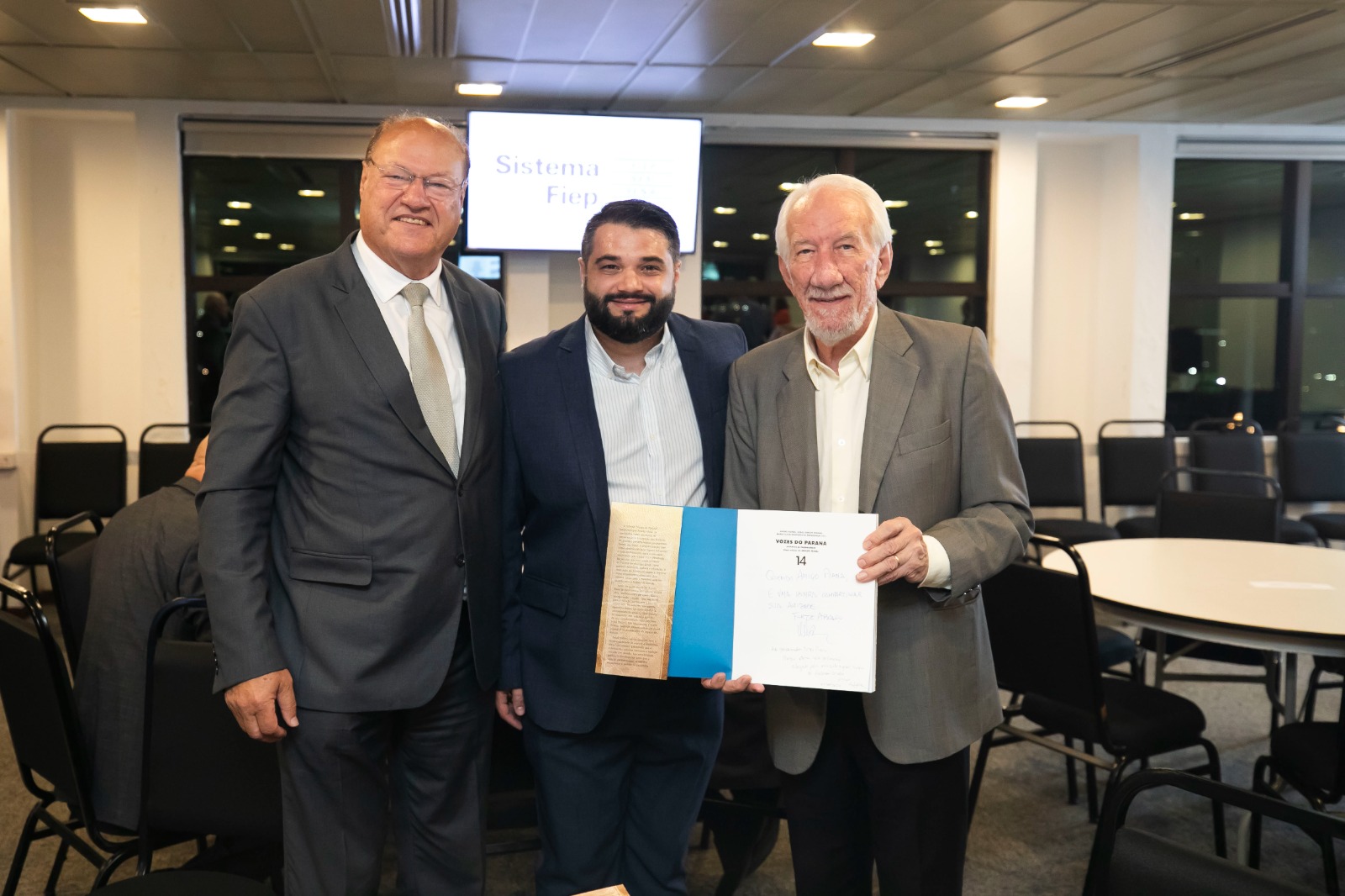Evento contou com a presença do vice-governador do Paraná, Darci Piana. Na foto, com o autor André Nunes e o empresário Helio Bampi, perfilado no livro, vice-presidente da FIEP