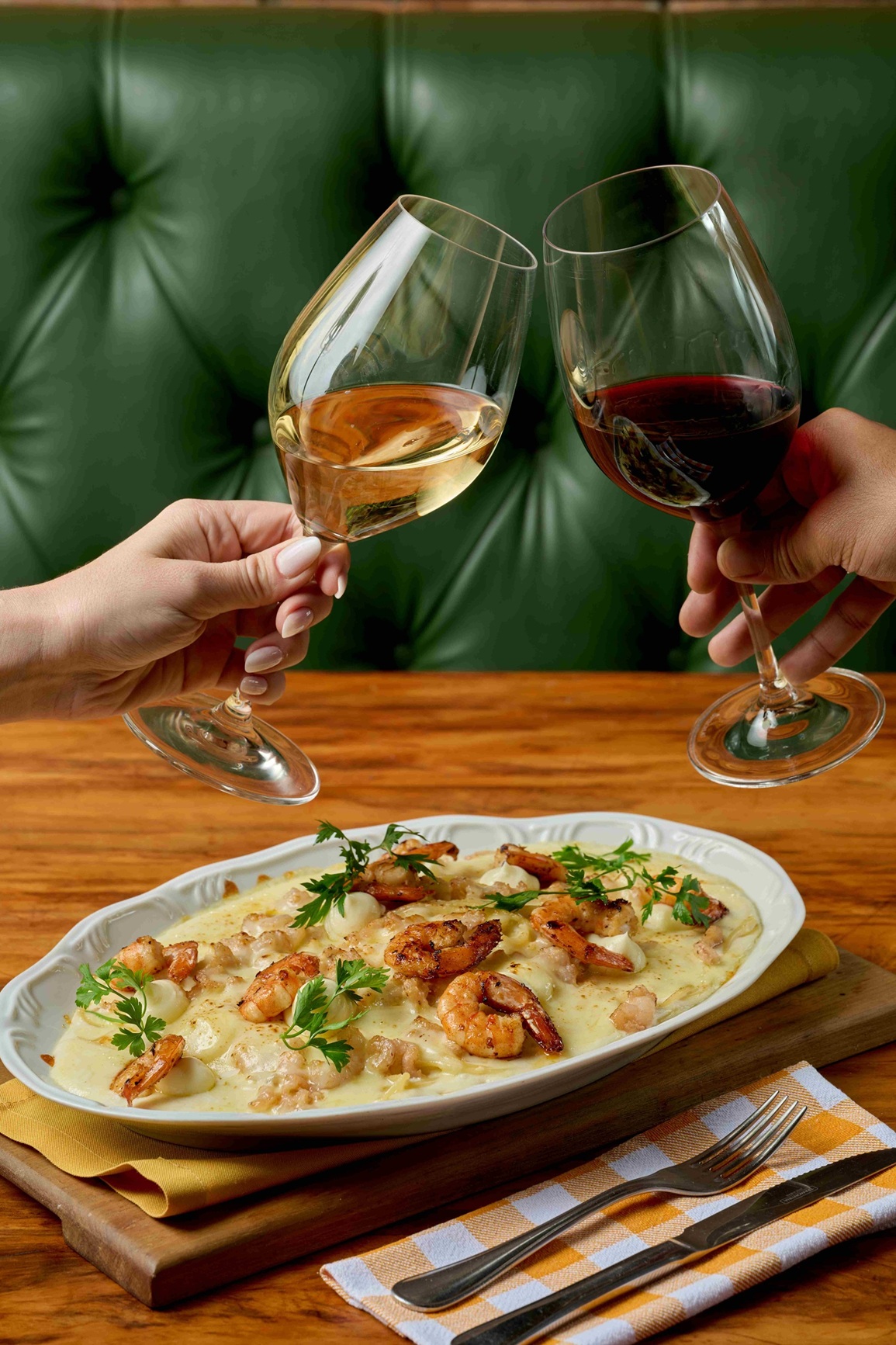 Os pratos principais equilibram conforto e sofisticação. O tortelli de costela (R$ 73) vem com gema mole e presunto de Parma crocante, enquanto o fettuccine com camarões (R$ 89) aposta na emulsão de parmesão para realçar o sabor do mar. Para quem gosta de dividir, há opções generosas como a lasanha da Nonna (R$ 141) e o filé à parmegiana (R$ 163), além do linguine com camarão ao molho de Catupiry (R$ 161), que faz sucesso entre os habitués.
