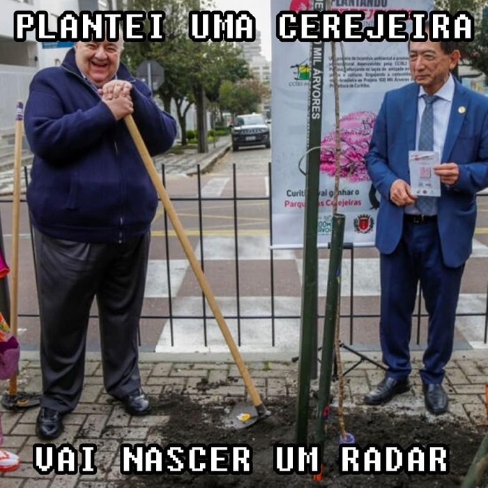 O “meme” em questão faz uma brincadeira de Rafael Greca segurando uma enxada depois de alguém plantar uma cerejeira, onde ele espera nascer um radar.