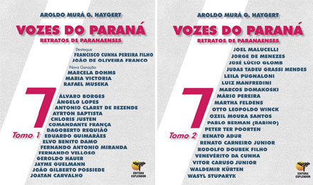 Pesando 3,3 quilos, o livro VOZES DO PARANÁ 7 – Retratos de Paranaenses, terá 824 páginas e cerca de 3 mil imagens destacam 40 personagens. Será apresentado numa caixa com dois tomos. Aroldo Murá G. Haygert é o autor. O lançamento será na quinta-feira, 10 de setembro, às 19:00, no EBS Business School (Rua Engenheiros Rebouças, 2176, Curitiba – Tel.: (41) 3123-8800.