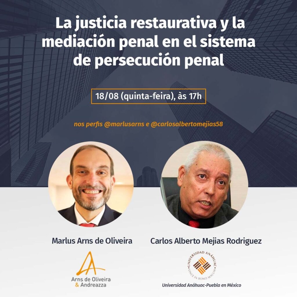 No evento online desta quinta-feira (18), o Advogado Marlus Arns de Oliveira e o professor Carlos Alberto Mejias Rodriguez (Universidad Anáhuac-Puebla de México), conversarão sobre o tema “La justicia restaurativa y la mediación penal en el sistema de persecución penal”.
