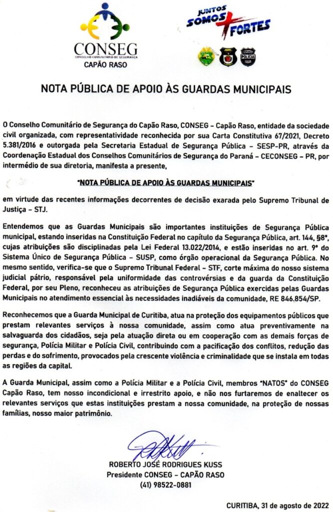 Sign in Welcome! Log into your account your username your password Forgot your password? Get help Política de privacidade Password recovery Recover your password your email A password will be e-mailed to you. HomeMemorialNota Pública: CONSEG Capão Raso apoia as Guardas Municipais Memorial Nota Pública: CONSEG Capão Raso apoia as Guardas Municipais 31 de agosto de 2022 Share FacebookTwitterWhatsApp Share FacebookTwitterWhatsApp Leia Também Memorial Mortes: Waldir Pedro Xavier Tavares 13 de outubro de 2025 Memorial Vinícola Araucária participa de festa do vinho em Guarapuava 21 de agosto de 2025 Memorial “Estas Palmas São Para Você” apresenta: Jaime Lerner 8 de agosto de 2025 Leia Também Curitiba terá seu primeiro condomínio-horizontal resort 12 de novembro de 2025 Padaria Requinte celebra o Natal com sabores artesanais 12 de novembro de 2025 ADVB/PR divulga os finalistas do Top de Marketing 2025 12 de novembro de 2025 Destaques na agenda cultural de 14 a 16 de novembro 12 de novembro de 2025 Fundação Copel celebra 54 anos com nova identidade visual 12 de novembro de 2025 CAIXA Cultural recebe espetáculos do Grupo Magiluth 12 de novembro de 2025 Load more