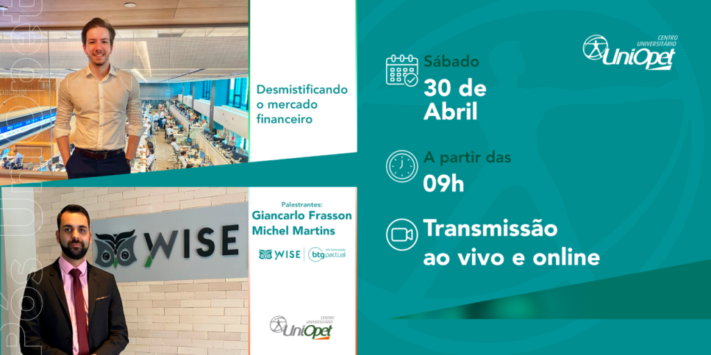 Iniciativa do Centro Universitário UniOpet, a oficina “Desmistificando o mercado financeiro”, neste sábado (30), das 9h às 11h, vai reunir os palestrantes Pablo Piero Comunello, sócio fundador da Wise, e Michel Martins, sócio e assessor de investimentos na Wise e na BTG Pactual. As inscrições são gratuitas pelo link.