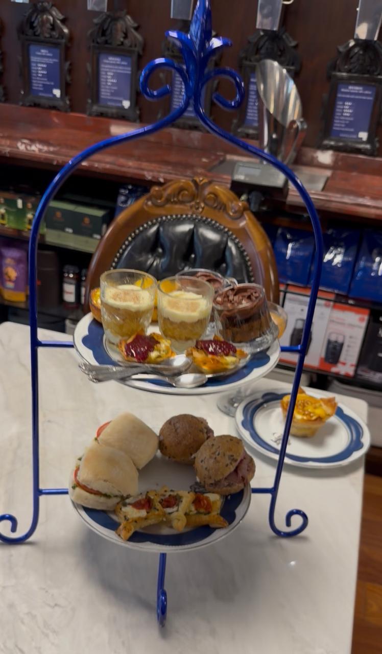 Eu indico a Torre degustação para dois, com três tipos de salgados e quatro de doces em versão mini, com duas unidades de cada. Preço é R$138,00.
