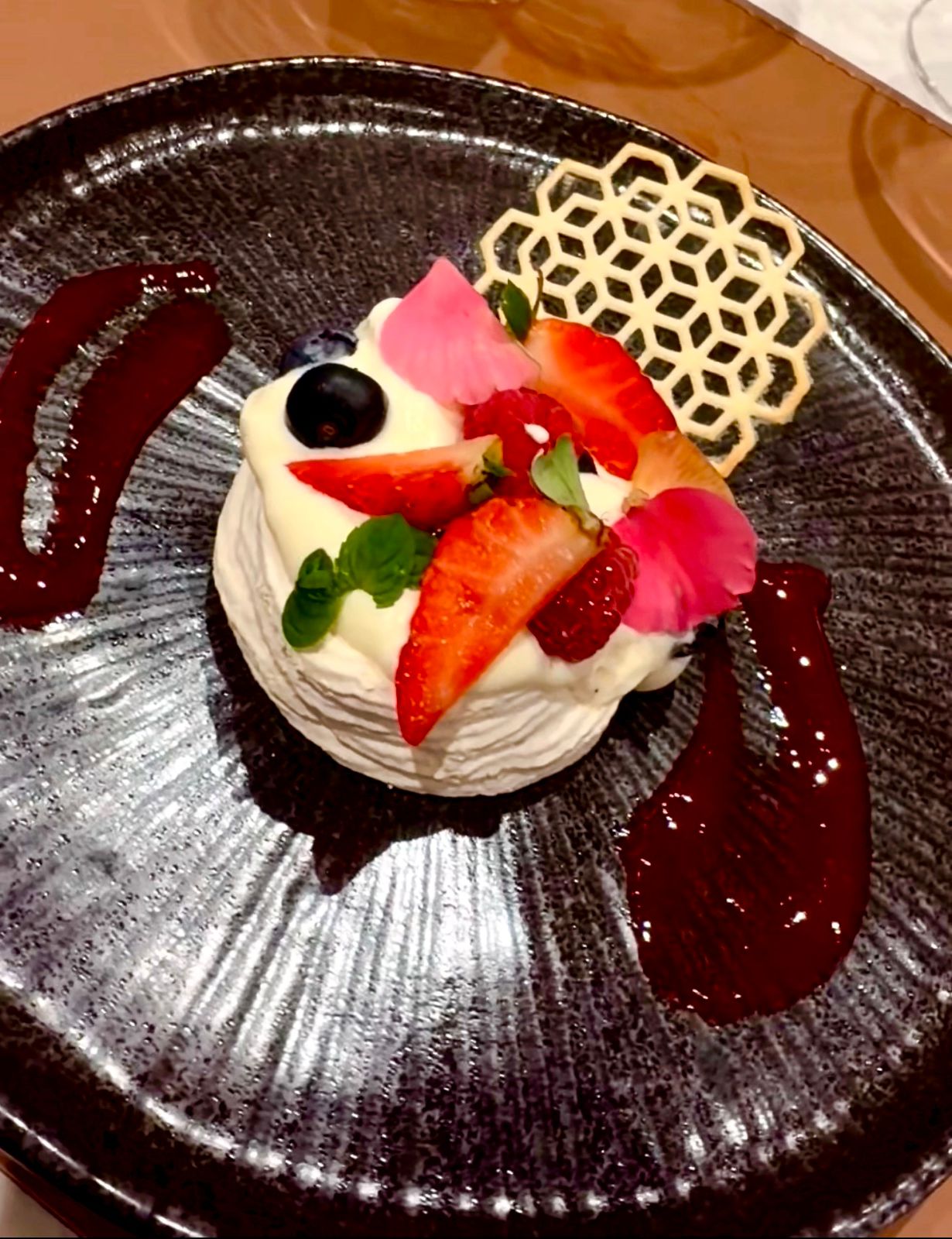Para fechar, uma pavlova de frutas vermelhas leve, elegante e com aquele contraste perfeito entre o suspiro crocante por fora, macio por dentro, um excelente creme bem batido e a acidez das frutas equilibrando o dulçor. As minhas amigas jornalistas Simone Meirelles e Simone Bello uniram forças pra bater o creme, que aliás ficou perfeito. Uma sobremesa que limpa o paladar e encerra a experiência com delicadeza.