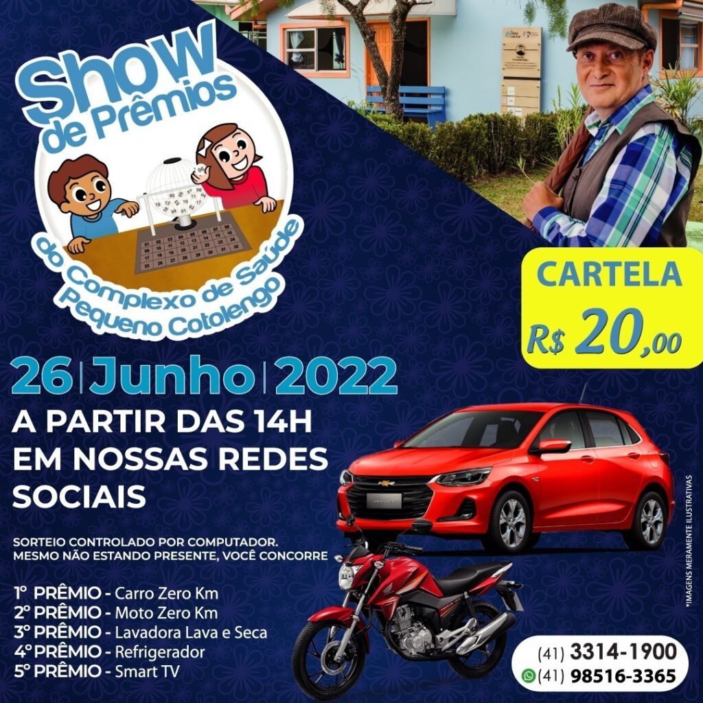 Já tradicional no Pequeno Cotolengo, o “Show de Prêmios” arrecada verbas para a manutenção geral da Organização, que acolhe 230 pessoas com múltiplas deficiências que estavam em situação de risco, além de egressos do SUS. Este ano, os prêmios são: