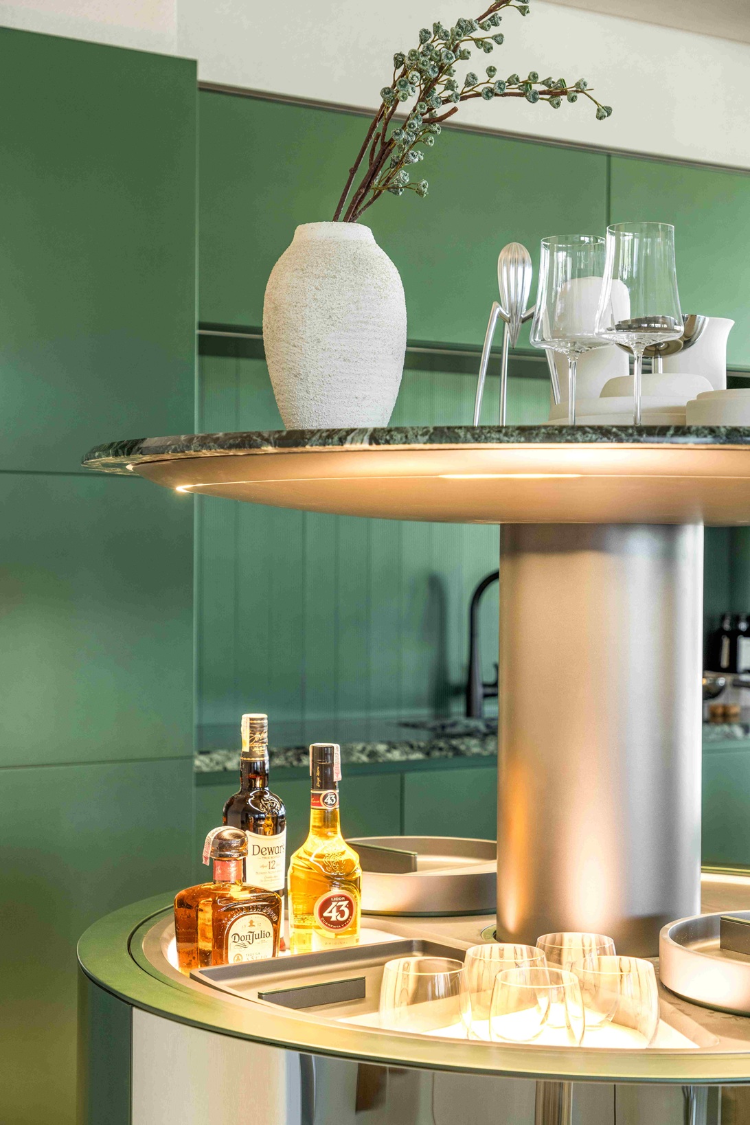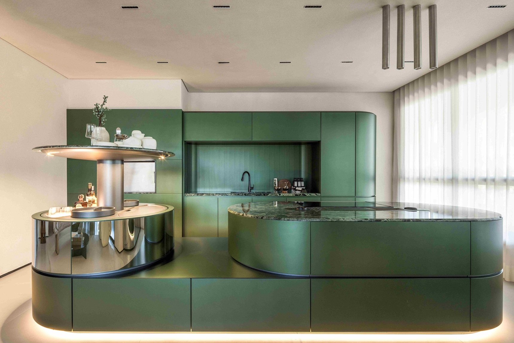 Entre os destaques está a ilha central com bar embutido, acionado por sistema de elevação. Quando não está em uso, o mecanismo permite ocultar o elemento, preservando a continuidade estética. Outro ponto relevante é o desenvolvimento integrado dos componentes, do puxador ao backsplash em alumínio, produzidos na mesma tonalidade para garantir acabamento uniforme.