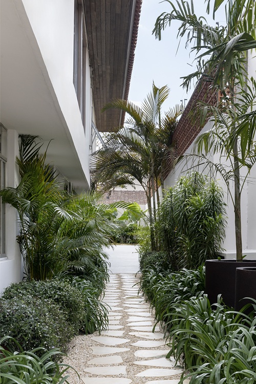 No ambiente de July, um refúgio de 125m² convida à pausa e à presença. Inspirado na paisagem tropical, o espaço é uma imersão sensorial em meio a texturas, luz suave e uma vegetação tão exuberante que se torna protagonista — “a luminária da vez”, como brinca a arquiteta. Tons de verde e off-white dominam a cena, transmitindo frescor e serenidade. O projeto é também um manifesto pela sustentabilidade: parte das plantas originais foi preservada e integrada ao novo paisagismo, mostrando que beleza e consciência ambiental podem caminhar lado a lado.