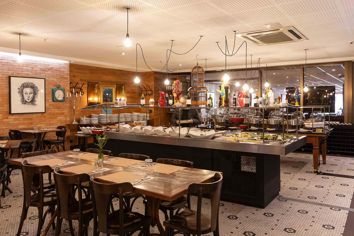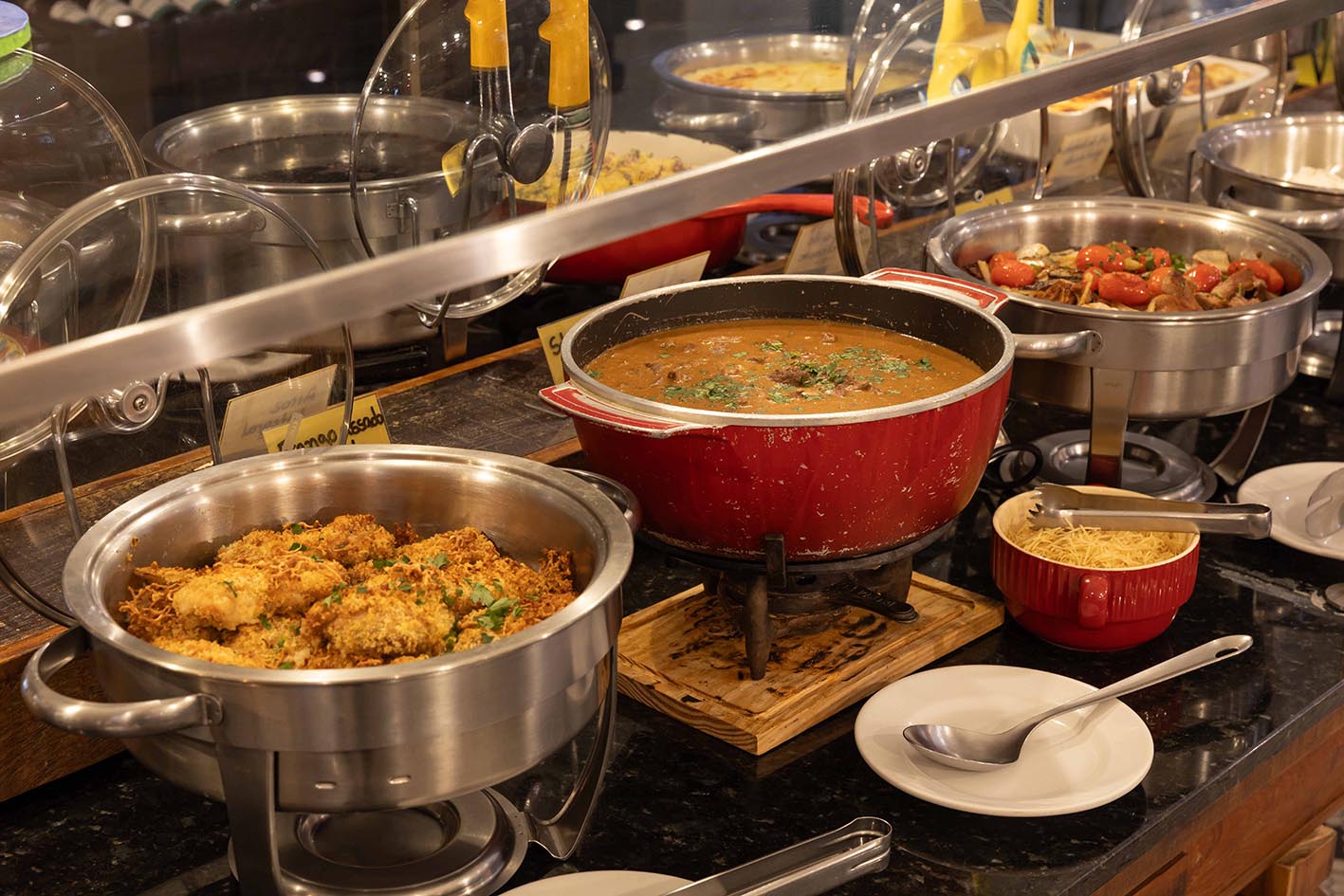 O buffet apresenta ainda outros pratos como Penne Alfredo com salmão e ervilhas, Couscous marroquino, Conchiglione quatro queijos, purê de batata salsa, legumes grelhados, opções de arroz branco e integral e o sempre querido feijão preto. Opções de saladas e sobremesa complementam o menu.