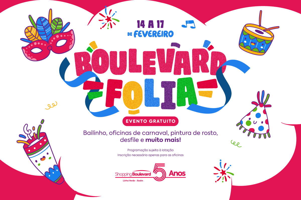 Assessoria – O Shopping Boulevard, localizado na Linha Verde, em Curitiba (PR), prepara uma programação especial de Carnaval voltada para toda a família, com atividades gratuitas que prometem muita diversão entre os dias 14 e 17 de fevereiro. A agenda reúne atrações infantis, oficinas criativas, música, brincadeiras e um dia exclusivo dedicado aos pets.