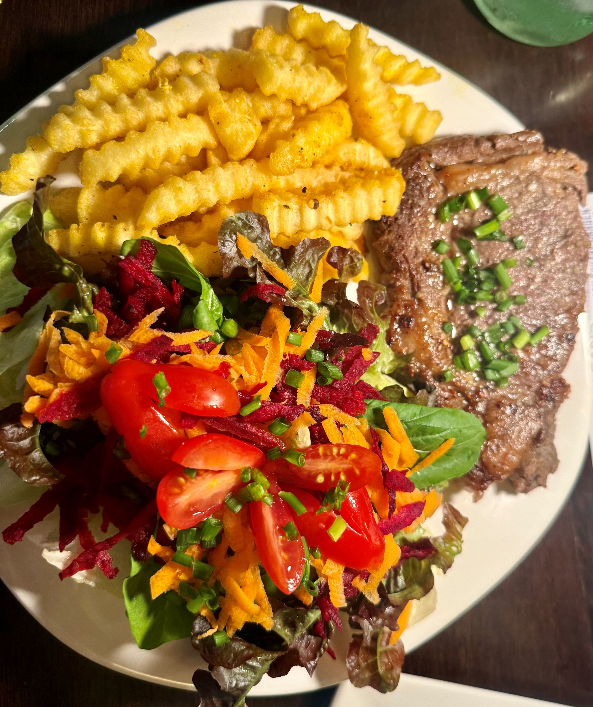 • Bife Ancho, Batata e Salada – Um suculento bife ancho (210 g) com batata frita e salada. R$ 56