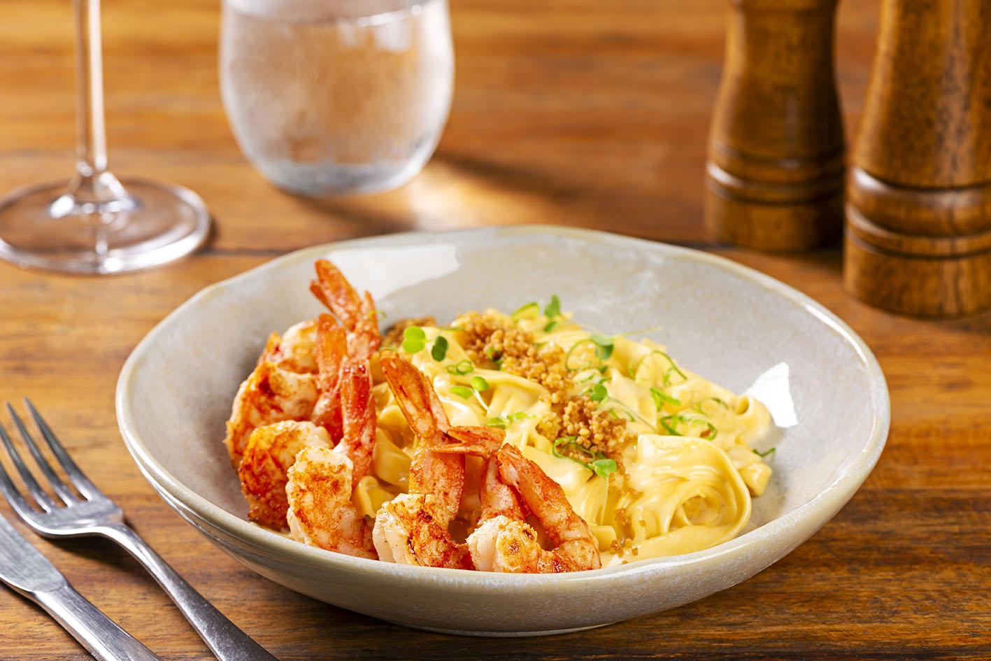 O segundo prato de verão também é preparado na brasa: Camarões grelhados na parrilla. Os cobiçados crustáceos são temperados com páprica defumada e servidos com fettuccine. O molho da massa, por sua vez, leva creme de leite, flambado com cachaça, e leva manteiga de bisque e limão siciliano. “Para finalizar, recobrimos o fettuccine com cuscuz marroquino hidratado no curry e frito como se fosse um pangrattato italiano, para adicionar textura e sabor”, conclui o chef.